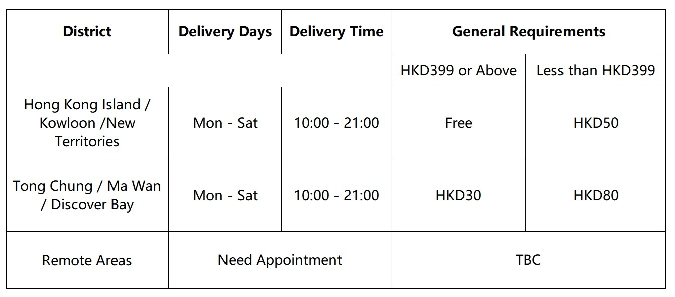 3.2 Specific delivery (installation on the same date): +HK$300 for delivery at a specific time, or/and; +HK$300 for delivery on a specific date