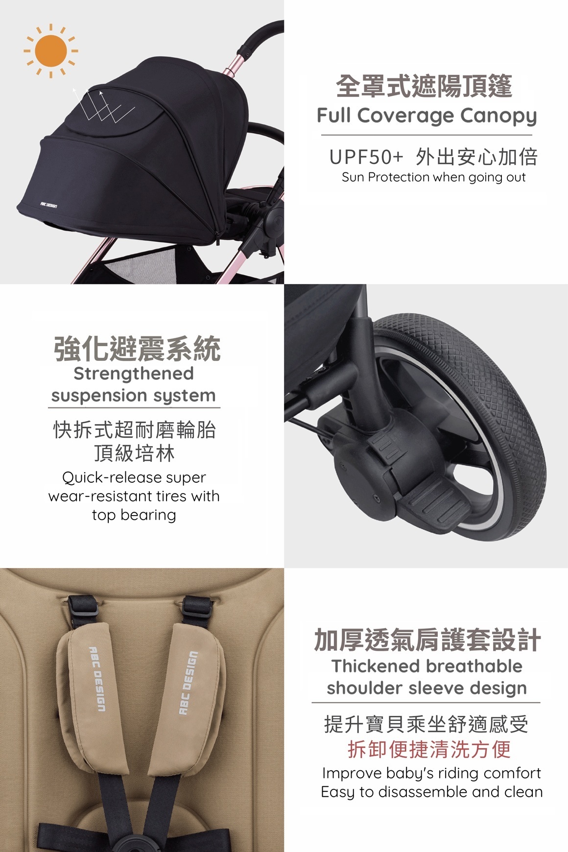 Four-stage adjustable full-cover canopy: with UPF50+ sun protection and splash-proof function, all-round protection for the baby.