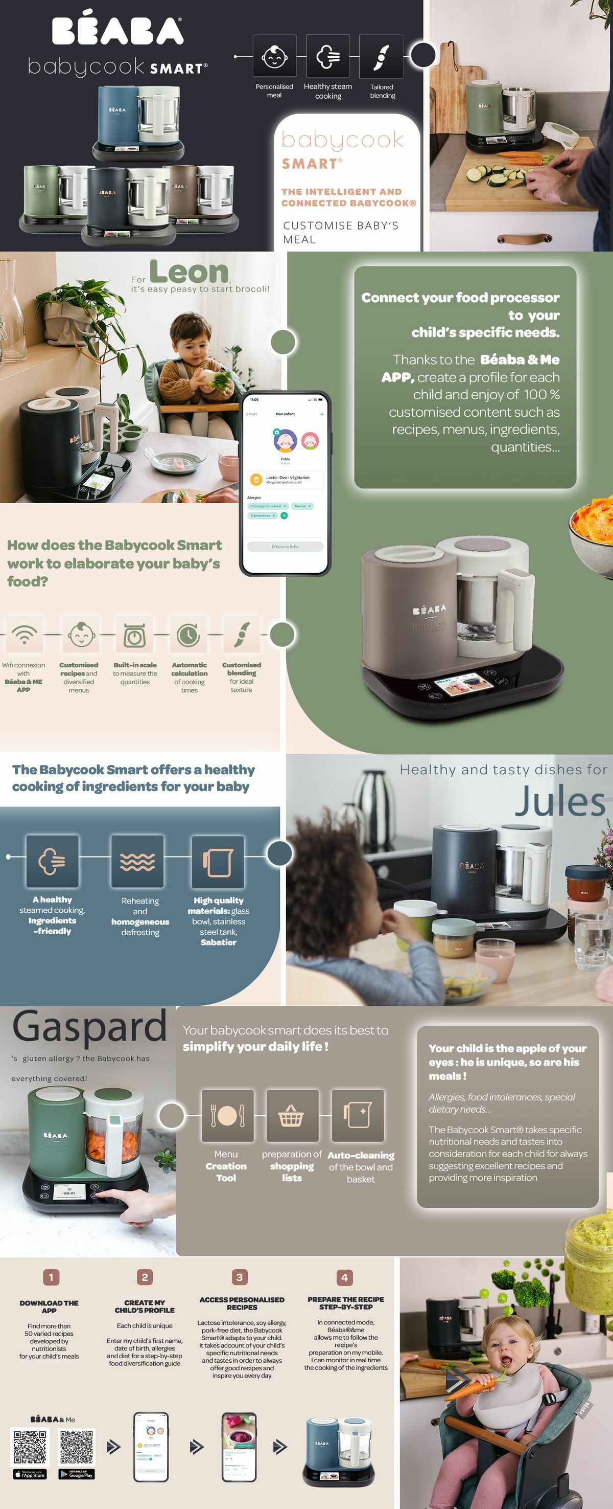 Helps parents with nutritional diversification every day by suggesting step-by step recipes, perfectly adapted to their baby’s needs. Good healthy meals, home-made, soft-steam cooked