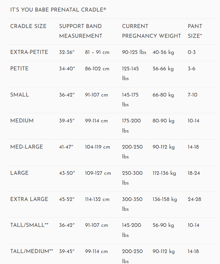 The It’s You Babe Best Cradle® prenatal baby belly band was designed by a medical professional for moms who want to feel comfortable and supported during their day-to-day activities. Perfect for twins and singletons, this lumbar support relieves pain from lordosis, backache, sciatica, and ligament strains. As the It’s You Babe Best Cradle® fortifies a woman’s core muscles, it reinforces the lower back, lifting the downward weight up from the pelvic girdle to relieve hip and pubic symphysis pain. The It’s You Babe Best Cradle® pregnancy support belt redistributes increasing weight and adjusts with a mama’s growing bump, providing incredible relief and comfort while on her feet. Wear under clothing. Made in the USA. Please follow our sizing guide to assist in selecting the proper size and fit, we have 3 sizes to choose from small to large