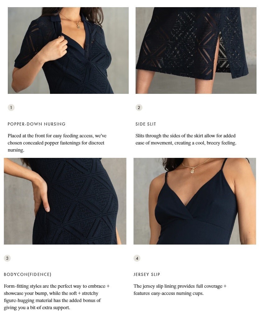 In a versatile navy shade, this elegant dress offers both style + practicality. The stretch fabric ensures comfort throughout pregnancy, while the half placket design provides convenient feeding access, making it ideal for special occasions or everyday wear.