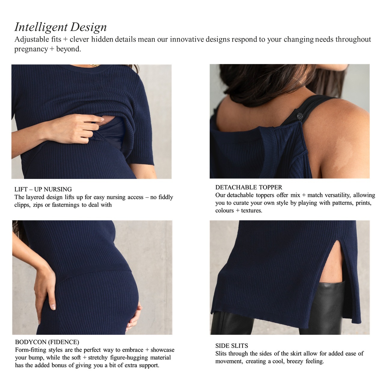 In a rich navy blue shade, this dress maintains its shape while adapting to your changing body. The sustainable viscose blend ensures breathable comfort for all-day wear, while the discreet nursing function makes it a practical choice that transitions seamlessly between different stages.