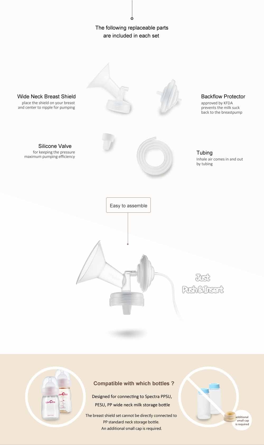 Mothers are recommended to replace their breast pump parts every 8-12 weeks for optimal performance and hygiene, this Spectra Single Breastshield set is compatible with Spectra S1+, S2+, Dual S, Dual Compact, 9+, Q electric breast pumps and also our manual breast pump which is a perfect set to buy when it is time to replace your breast pump parts.