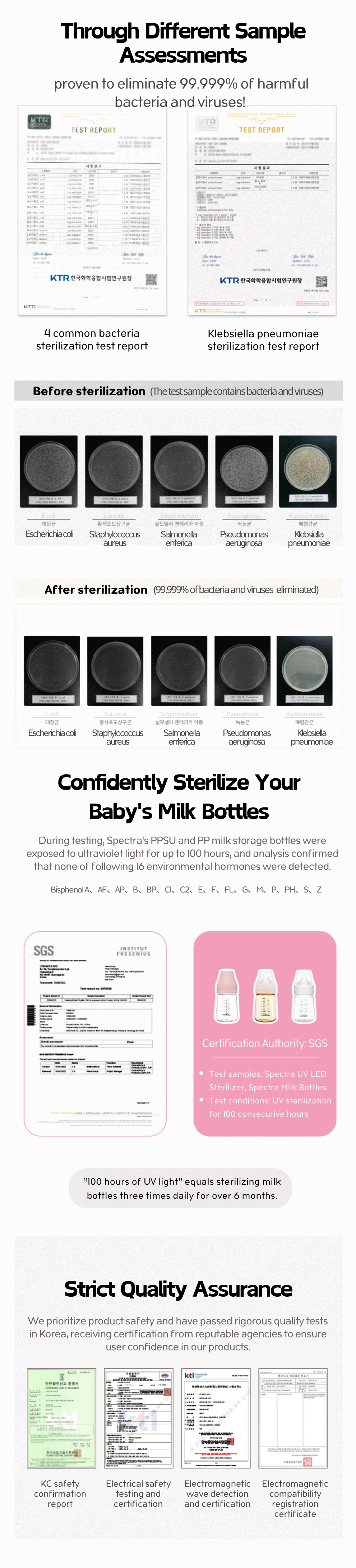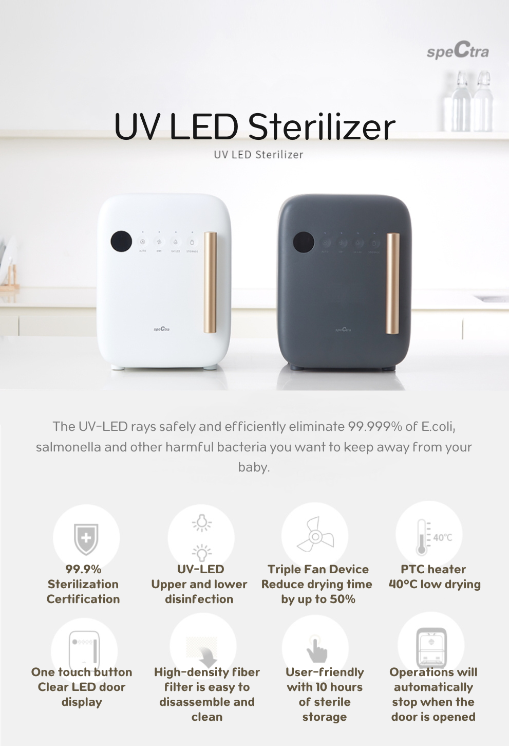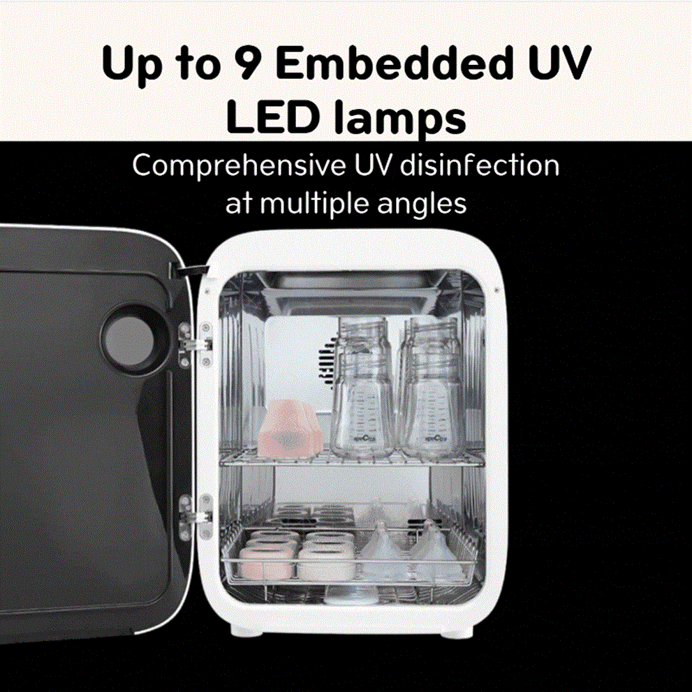 The new Spectra UV-LED Sterilizer is an innovative device suitable for users of all ages, from babies to adults. It serves three key functions: UV-LED disinfection, low-temperature drying, and sterile storage. Utilizing the latest in ultraviolet UV-LED technology, it ensures efficient and comprehensive 360° disinfection with no blind spots. This machine has successfully passed stringent quality and bacterial sample tests, proving its ability to eliminate up to 99.999% of harmful bacteria and viruses, including Escherichia coli, Staphylococcus aureus, Salmonella enterica, Pseudomonas aeruginosa and Klebsiella pneumoniae etc.