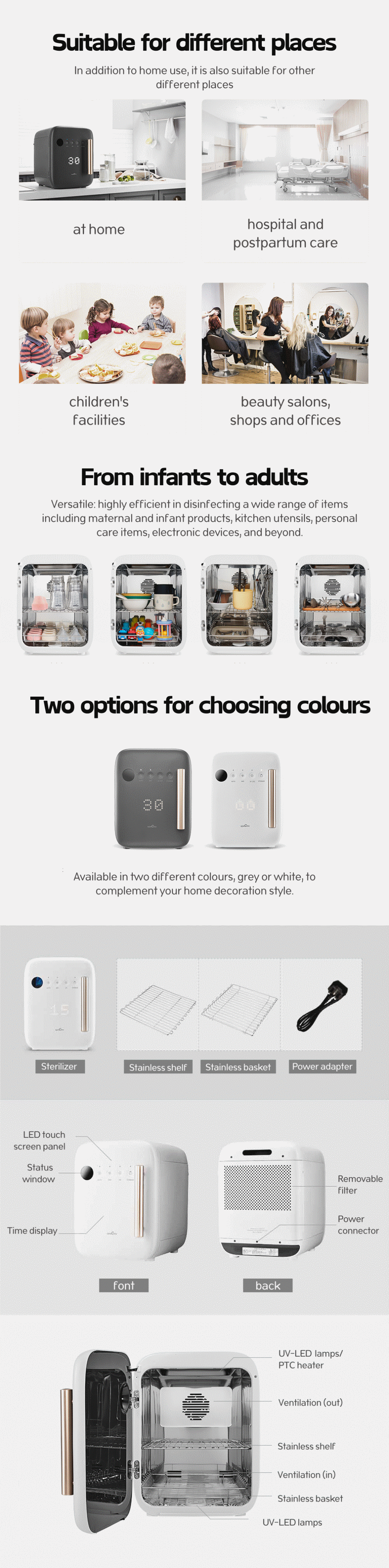 Drying /sterilization method: built-in PTC low-temperature thermostat heater/ UV-LED ultraviolet lamp