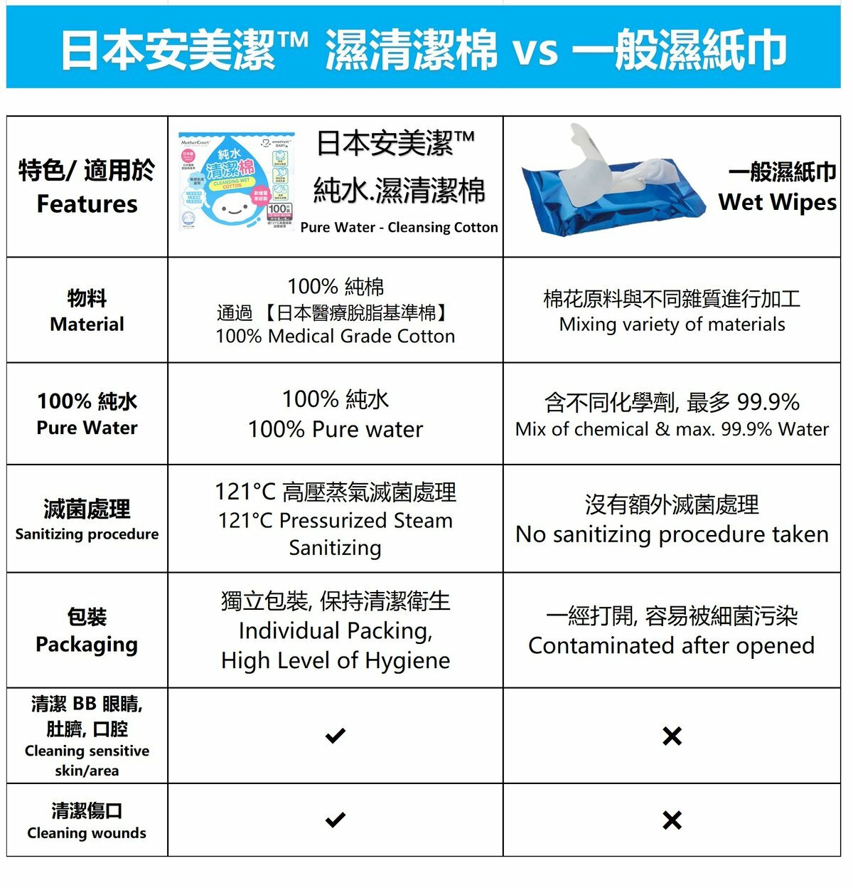 2. 醫護處理一般傷口時, 會選擇使用棉花, 因為純棉是比使用不同雜質製成的紙巾衛生, 日本安美潔™ 濕棉: 1. 是採用100% 天然純棉, 而且通過「日本醫療脫脂棉基準」; 2. 原自日本水源及 100% 純水 ; 3. 經 3 次過濾及 121℃ 高壓蒸氣滅菌處理,可安心清潔媽媽生產後的傷口, BB 眼睛, 肚臍及脷苔