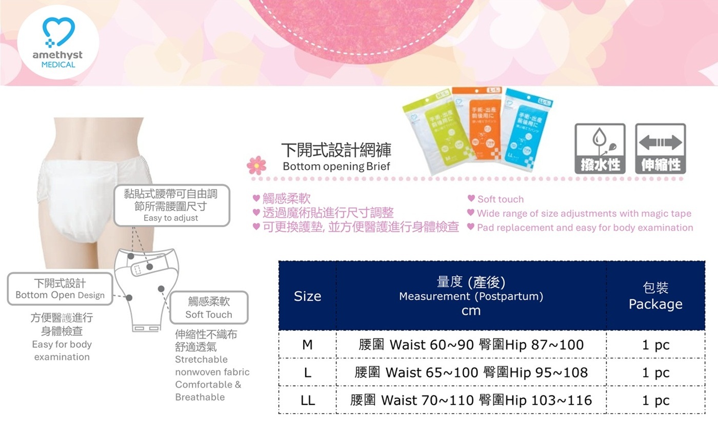 好處: 丁字褲下開式設計, 當清潔或檢查傷口時, 只需打開魔術貼, 不需將移動腿部, 減少因移動腿部而觸動到傷口的痛楚.