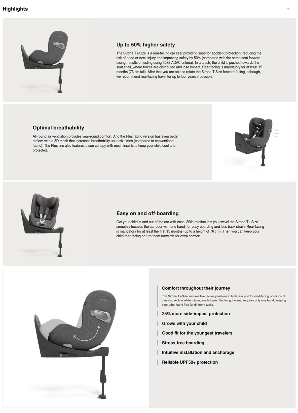 兒童身高:Group 0+/1: 45-105厘米 (向後); 76-105厘米 (向前)