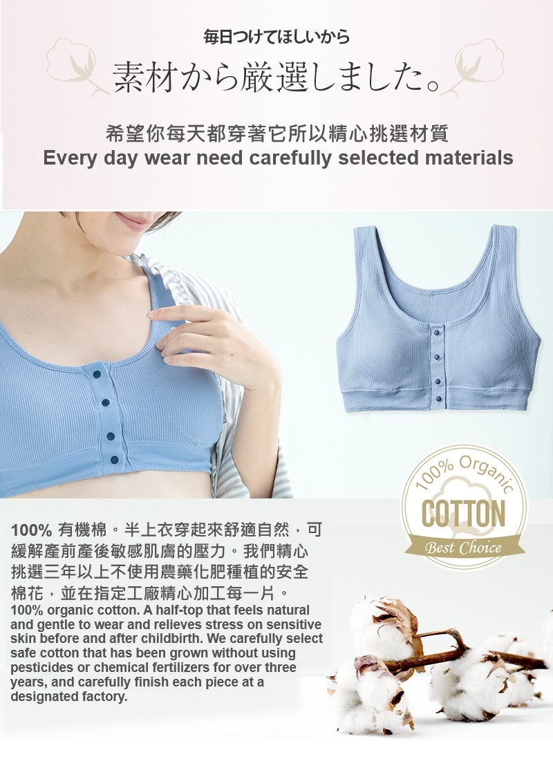 - 哺乳半上衣由 100% 有機棉製成。
