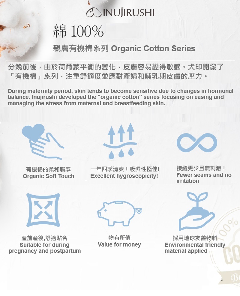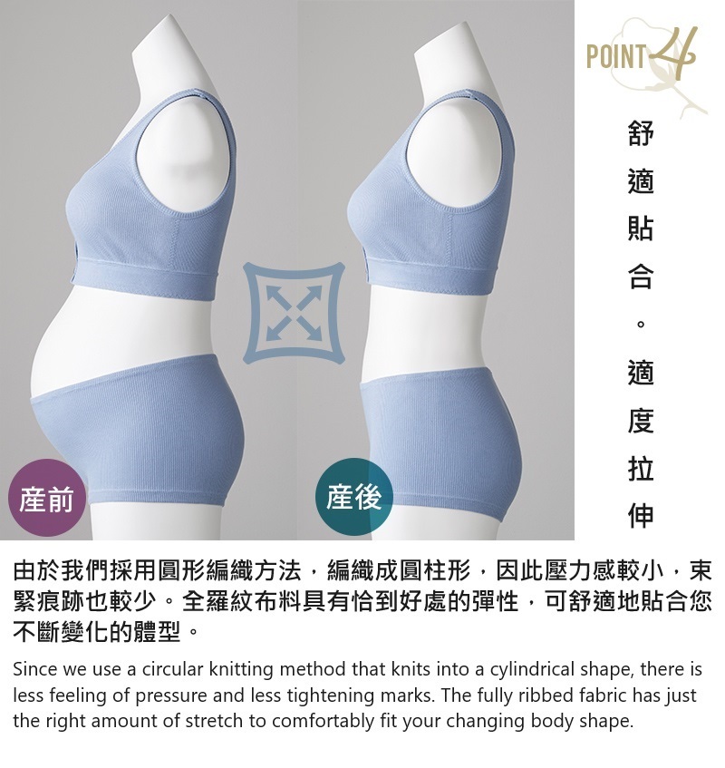 「有機棉」系列穿著溫和舒適,解決了懷孕期間和產後皮膚敏感的問題。