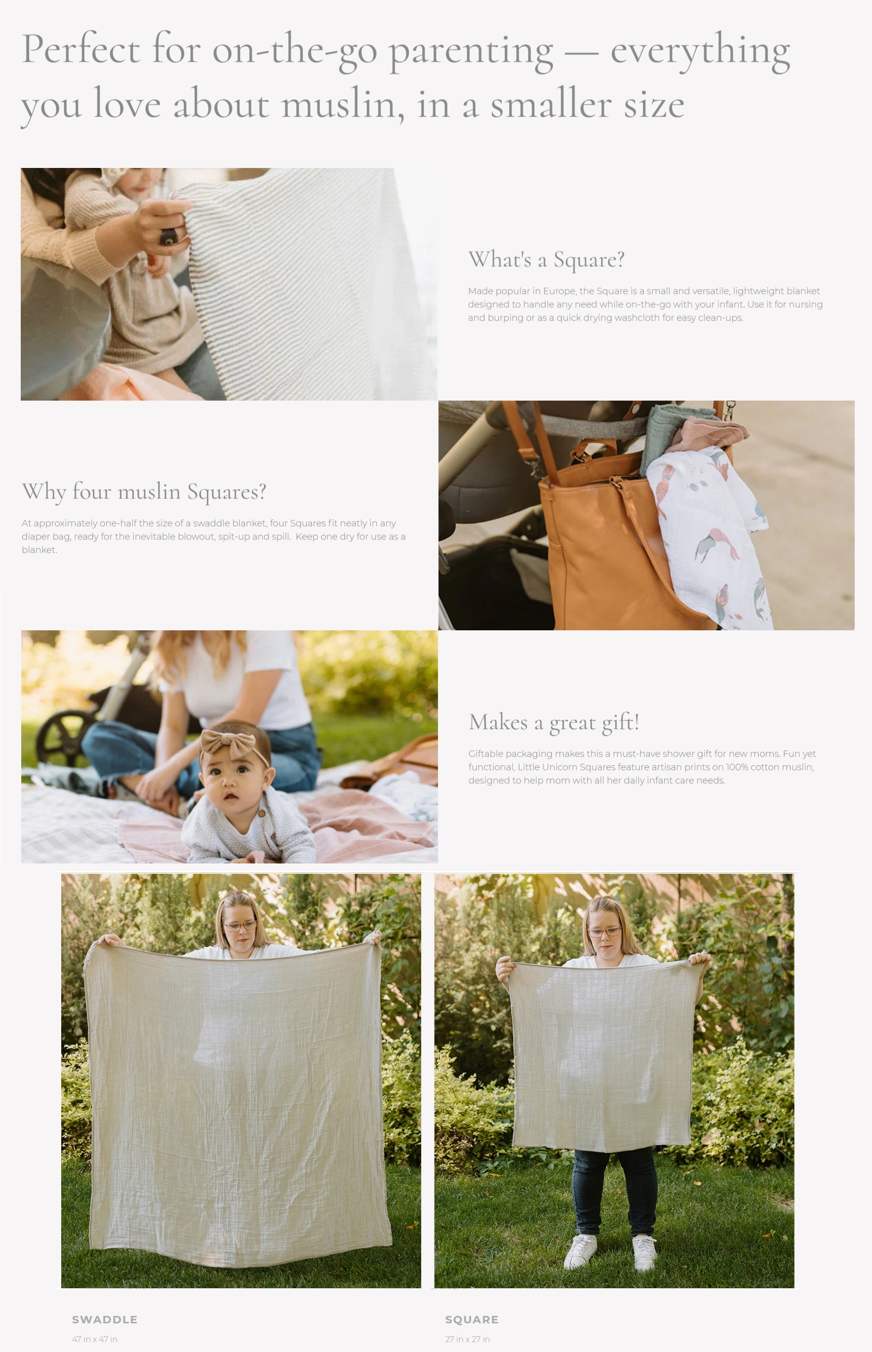 平紋細布方塊擁有您喜愛的平紋細布的一切,尺寸較小,非常適合...幾乎所有用途 - 打嗝、哺乳、餵食、清潔、舒適的毯子、玩耍等等。它們對寶寶的皮膚很溫和,是完美的禮物。