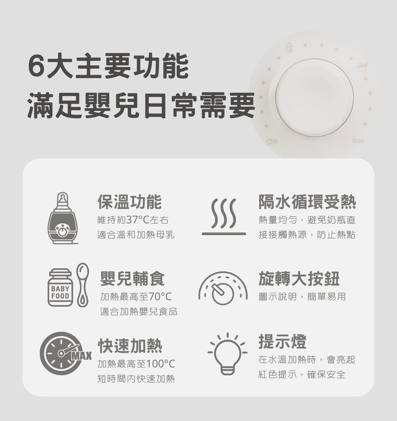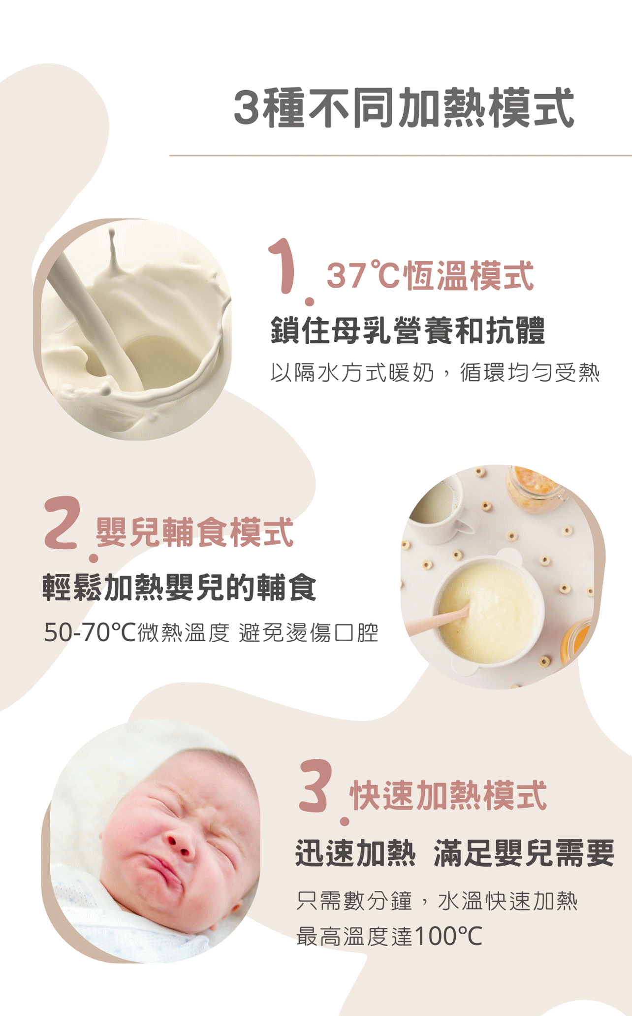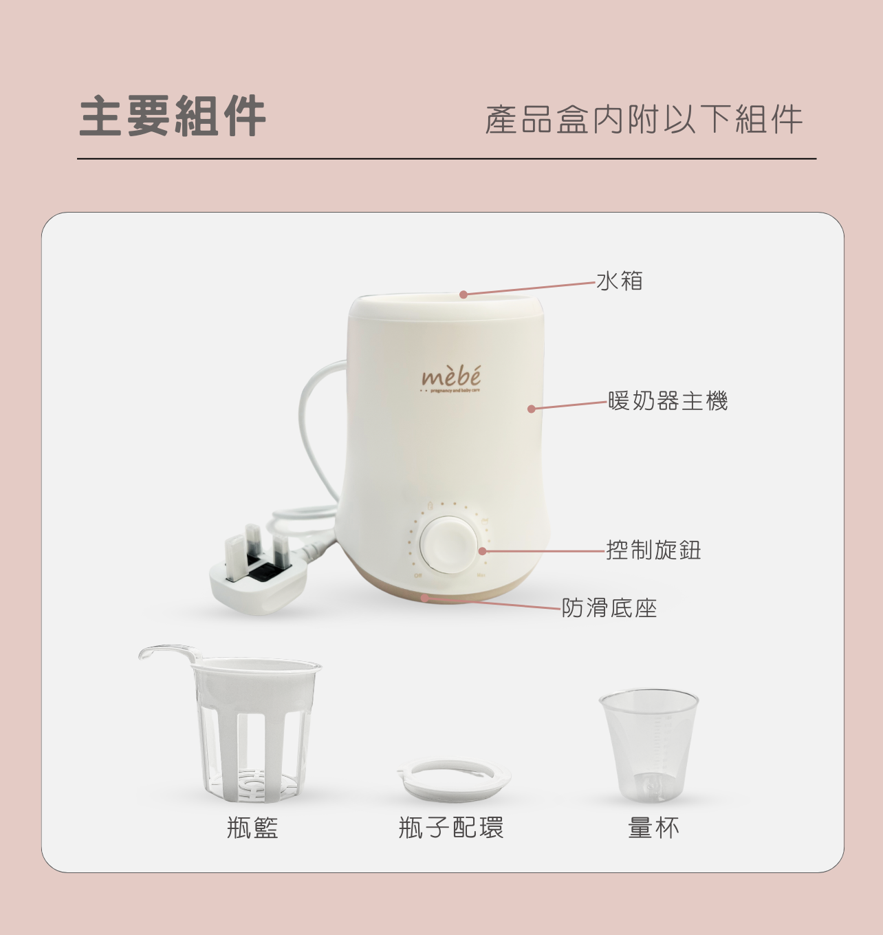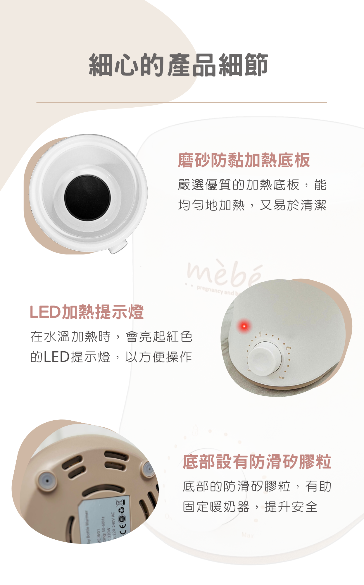 新推出的 mèbé 多功能暖奶器,只有一個控制旋鈕,操作簡易,適用於市面上大部分常見的儲奶瓶和容器。 內置三種不同加熱模式,恆溫設計,能保持水溫,又能避免過度加熱,讓您可以快速、安全地加熱母乳、奶瓶和各類嬰兒輔食飲料,更可以節能的方式持續保持溫暖,以滿足寶寶的日常需要。