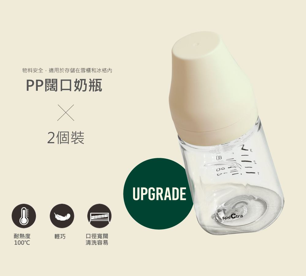 全新的Spectra PP闊口儲奶瓶連瓶上蓋160ml,可接駁吸奶喇叭以盛載泵出母乳,也可駁上專用奶咀來餵哺寶寶。