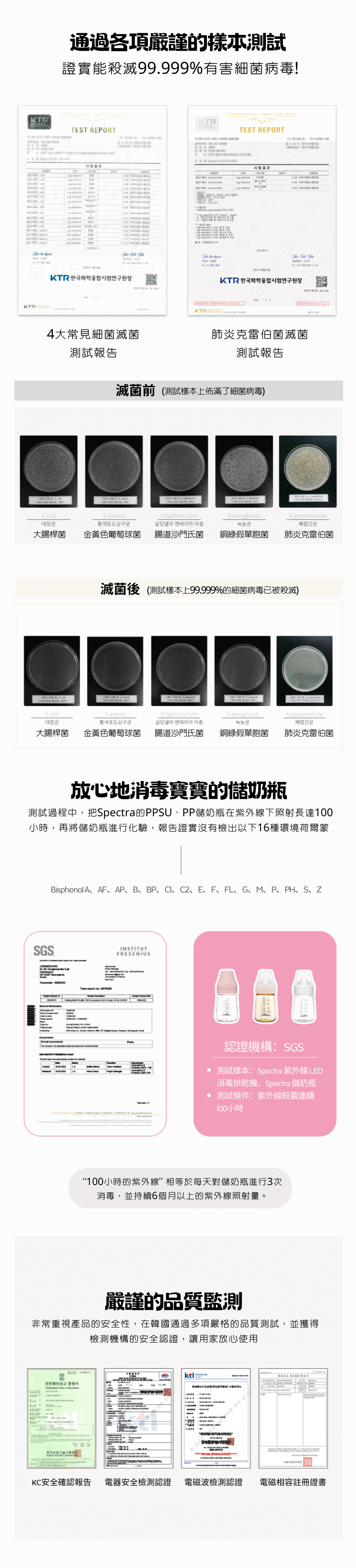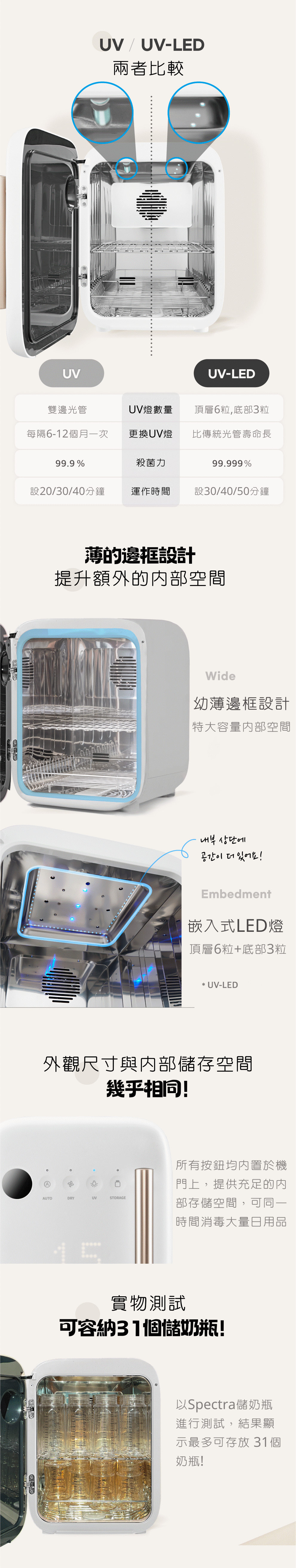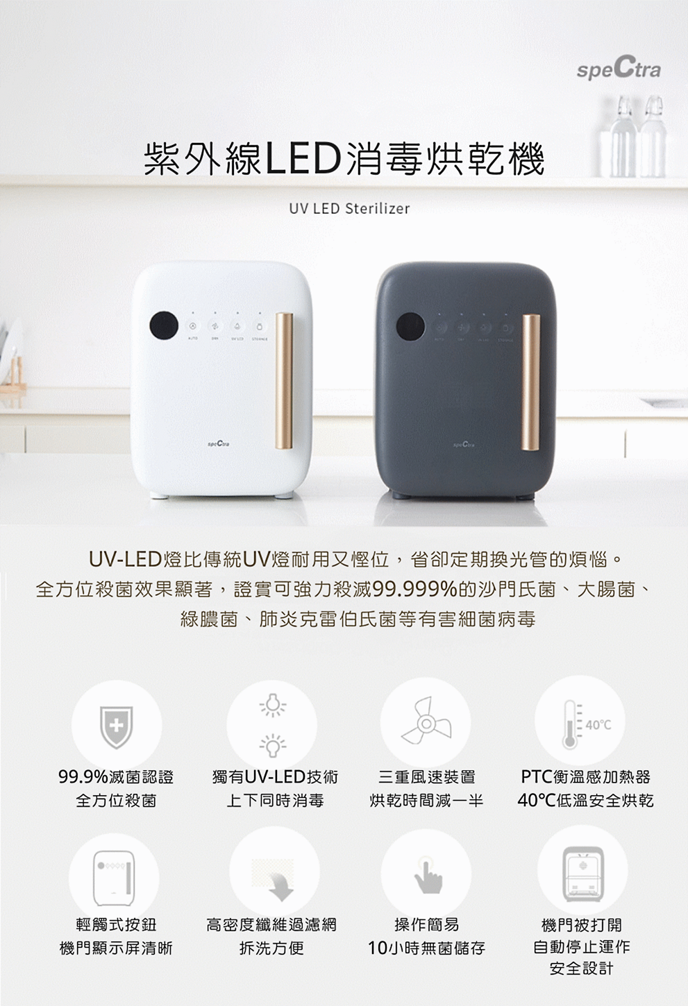 全新的Spectra紫外線UV-LED消毒烘乾機,是一部由嬰兒到成人階段都可使用的智慧型消毒烘乾電器,有齊UV-LED消毒、低溫烘乾、無菌儲存三大功能 ! 它採用業界最先進的紫外線UV-LED燈高效徹底消毒,通過多項嚴格的品質和細菌樣本測試,證實可強力殺滅高達99.999%的有害細菌病毒,包括:大腸桿菌、金黃色葡萄球菌、腸道沙門氏菌、銅綠假單胞菌和肺炎克雷伯菌等。最新研發的UV-LED燈耗電量低、體積細小,而且壽命比傳統的UV光管更長更耐用,省卻過往每6-12個月定期更換光管的不便。
