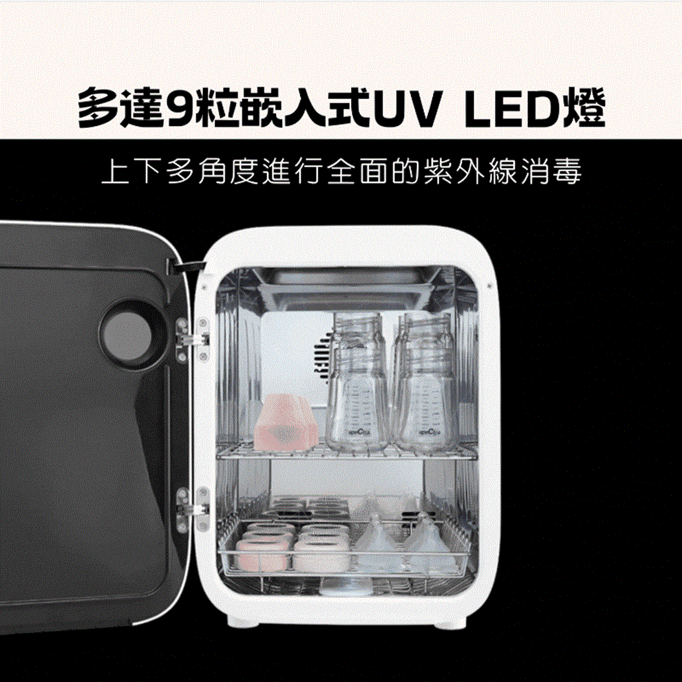 嚴選最佳殺菌波長的275nm UV-LED燈,機內採用優質的高反射率SUS304超鏡面不銹鋼材質製造,上下多達9粒UV-LED燈以多角度的紫外線反射進行徹底消毒。升級的幼薄邊框設計,配上嵌入式LED燈,機內的儲存空間大幅度提升。平面的一鍵輕觸式顯示屏,使用簡易。內置4款不同的操作模式,以配合消毒烘乾不同家居用品時的需要。另外,只需輕按存儲按鈕2秒,便可以關閉顯示屏上按鍵的聲音,不會打擾正在熟睡的小寶寶。