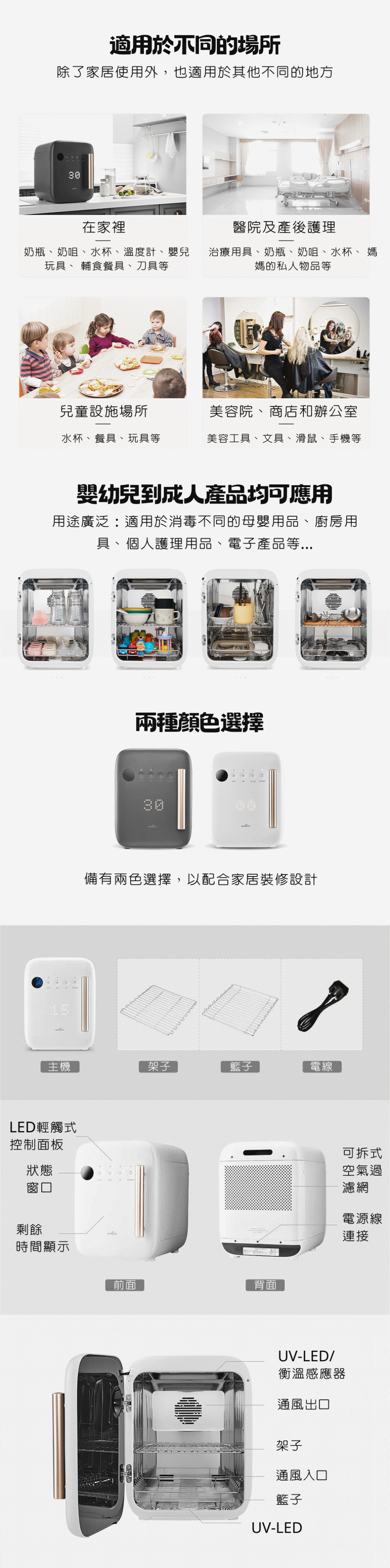 用途廣泛 : 適用於消毒不同的母嬰用品,例如: 奶瓶奶咀、奶泵配件、餐具、毛巾、玩具、牙刷等;也適用個人護理用品,例如: 化妝用具、銀包、眼鏡等;同時適用於難以自行清潔的手提電話、遙控器等電子產品 (乳膠產品除外)