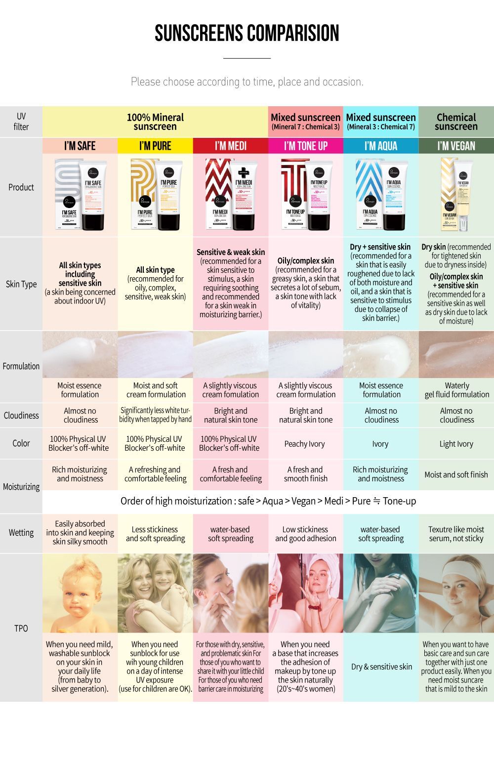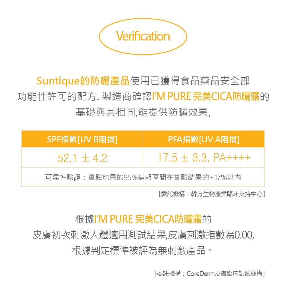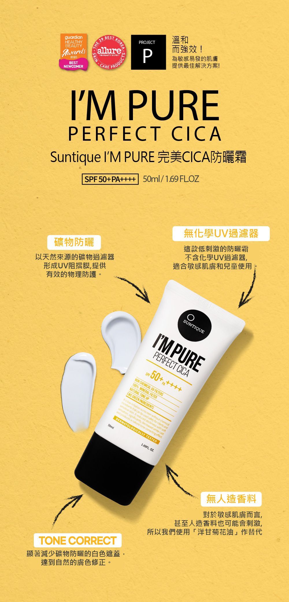 I’M PURE 完美CICA防曬霜,這款無刺激的防曬霜不含化學紫外線過濾成分,適合兒童和敏感肌膚安全使用。