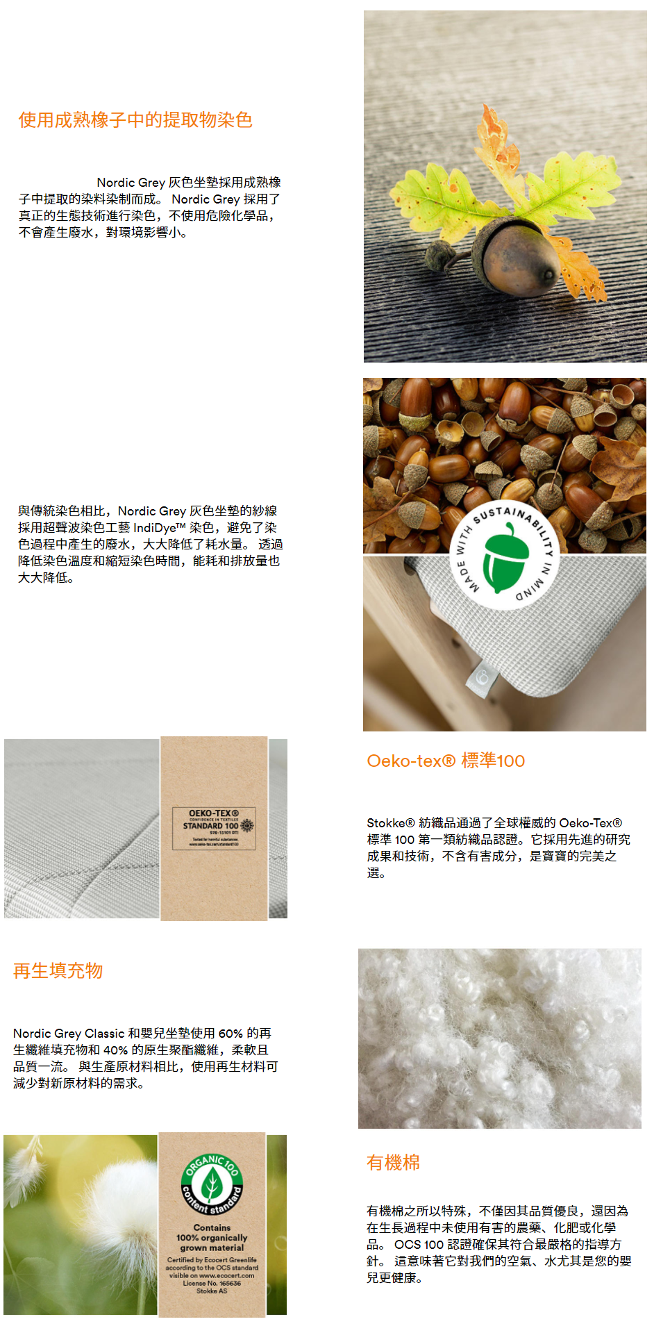 Tripp Trapp® Nordic Grey 灰色坐墊採用成熟橡子中提取的染料染制而成。 Nordic Grey 採用了真正的生態技術進行染色,不使用危險化學品,不會產生廢水,對環境影響小。
